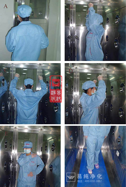 2、進入風(fēng)淋室后:徑直通過光電感應(yīng)器,吹淋開始,請在室內(nèi)將雙手抬起后360度旋轉(zhuǎn)吹淋;